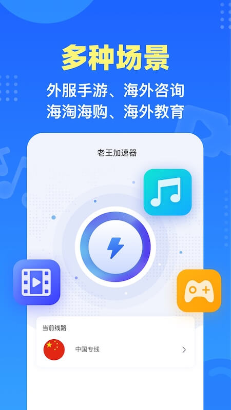 专门针对用户提供国际网络线路优化加速,提供简单的一键加速,无需选择游戏、视频音乐等软件,并对海外华人畅听国内视频音乐等进行加速优化。对全球游戏进行特殊优化,减少网络延迟,降低丢包率,减少卡顿,解决游戏移动网络下容易掉线、联机困难等问题;